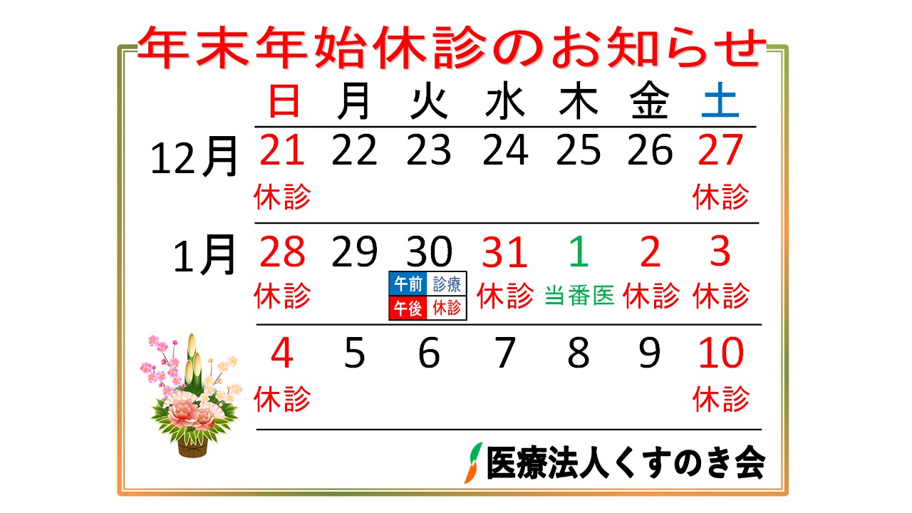 2025年の年末年始の診療をご案内します。お間違えの無いようにご確認をお願い致します。