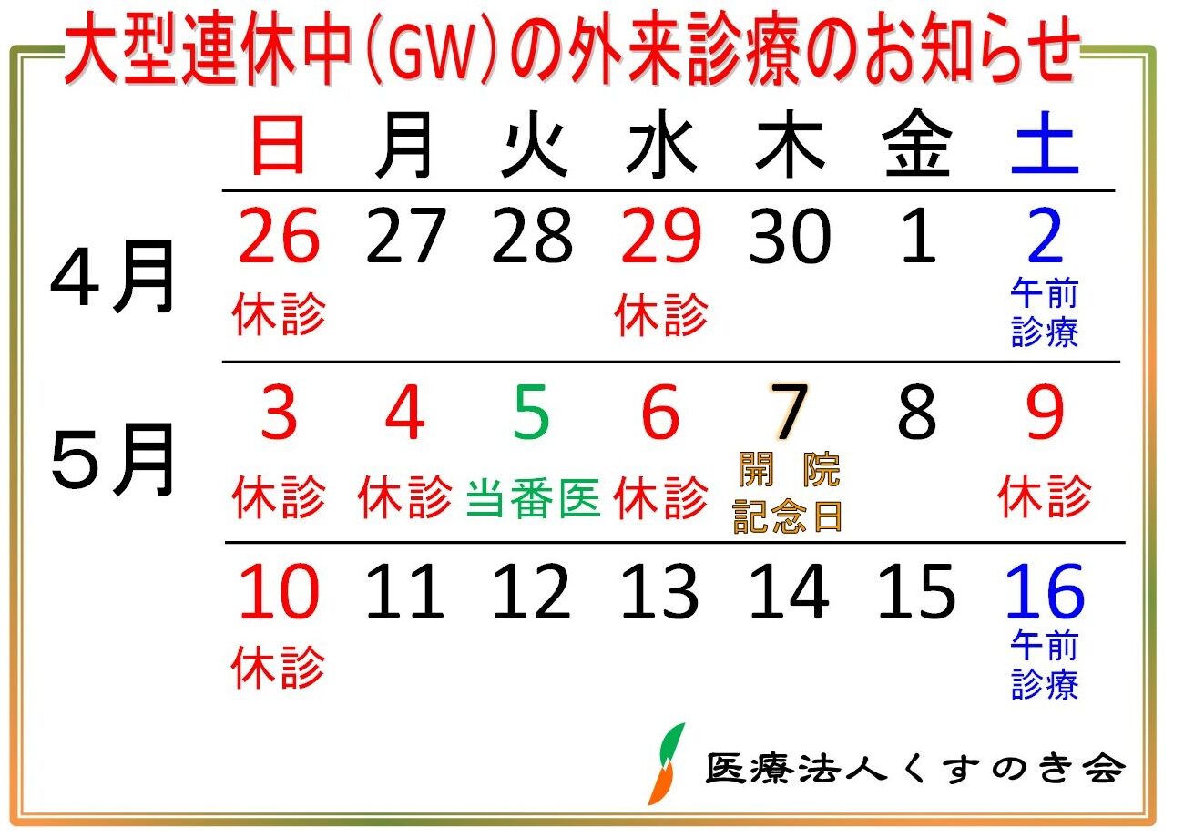 2026年の大型連休中の診療日です。
